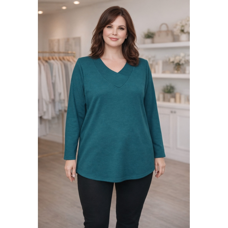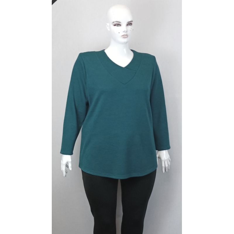 Enyhén ívelt aljú, széles karbőségű,V-nyakú, válltöméssel kiegészített, kötött női pulóver. Az alja nem sliccelt. Elasztikus anyaga kellemesen puha, meleg, jól szellőzik. Magyar készítő terméke (Klívia). Anyagösszetétel: 70% pamut, 25% akril, 5% elasztán. A próbababa 185 cm magas.